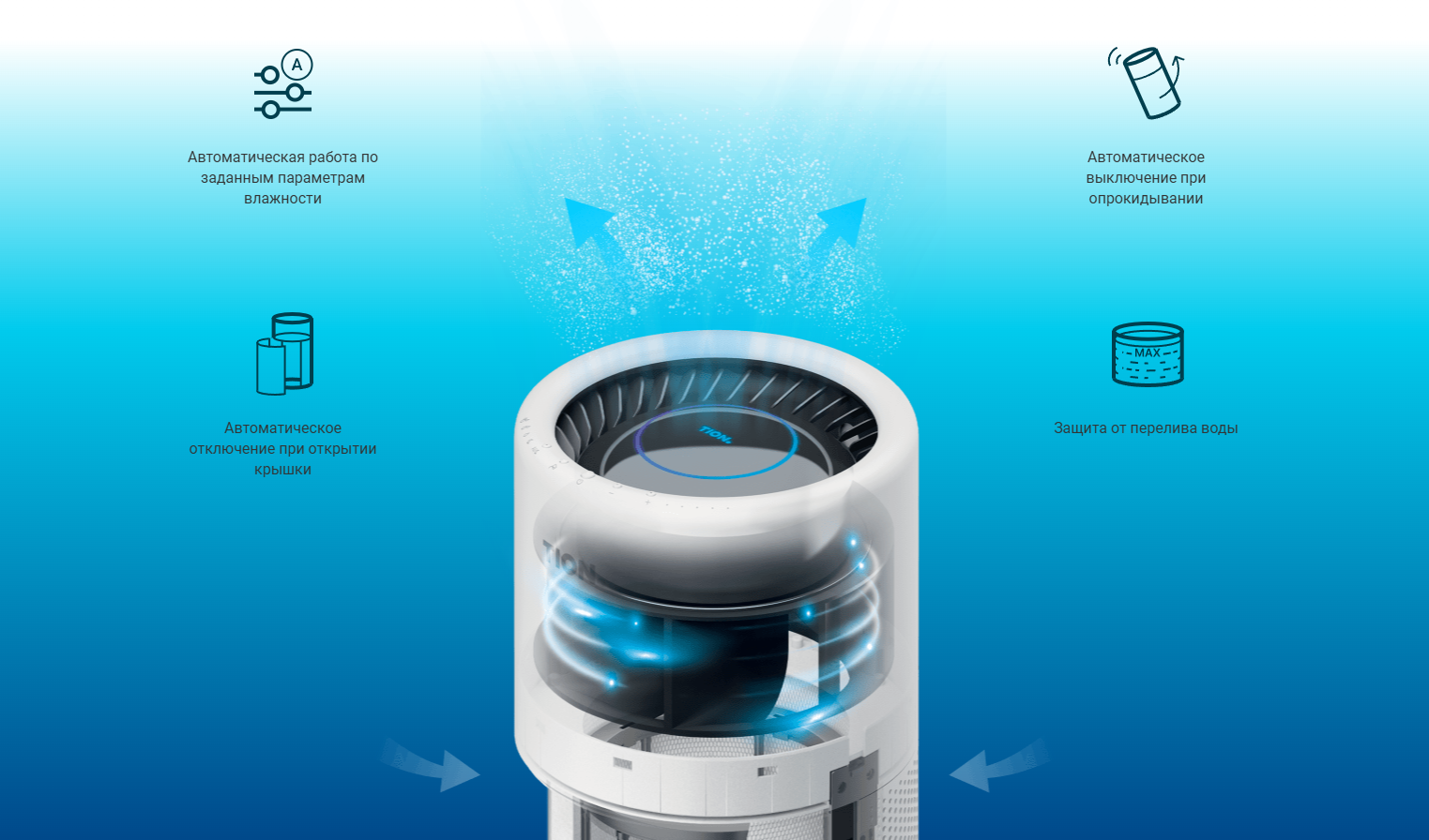 Сухой воздух забирается из помещения при помощи вентилятора и насыщается молекулами воды, проходя через увлажнённый фильтр. Влажность эффективно повышается без попадания в воздух солей жесткости и образования налета. Такой процесс естественного испарения воды называется адиабатическим — наиболее безопасный и экологичный принцип увлажнения воздуха.