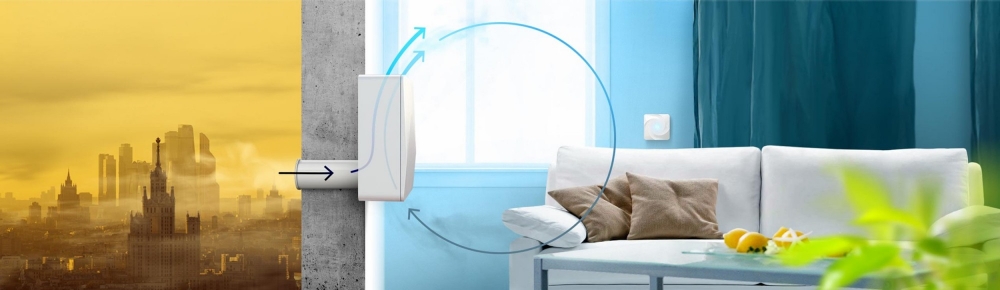 Это устройство приточной вентиляции, которое принудительно подает кислород с улицы, очищает его фильтрами и подогревает до комнатной температуры. Установка такого прибора позволяет избавиться от духоты и получить свежий воздух с улицы, не открывая окна.