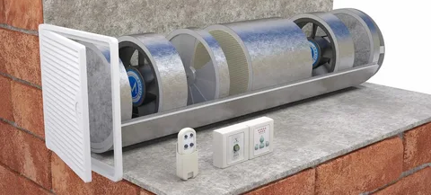 Искусственная вентиляция осуществляется принудительно. Кислород с улицы поступает в воздухозаборник, в блок вентиляции и распределяется по комнатам. Отработанный воздух отсасывается и выводится на улицу. Такие системы позволяют создавать определенный микроклимат — очищать, подогревать, увлажнять или осушать воздух.