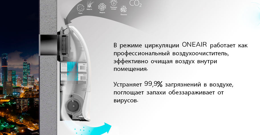 Эффективная очистка воздухаВ режиме циркуляции ONEAIR работает как профессиональный воздухоочиститель. Прибор оснащен 6-ступенчатой системой очистки, проходя через нее воздух очищается и обеззараживается от вирусов и бактерий. |