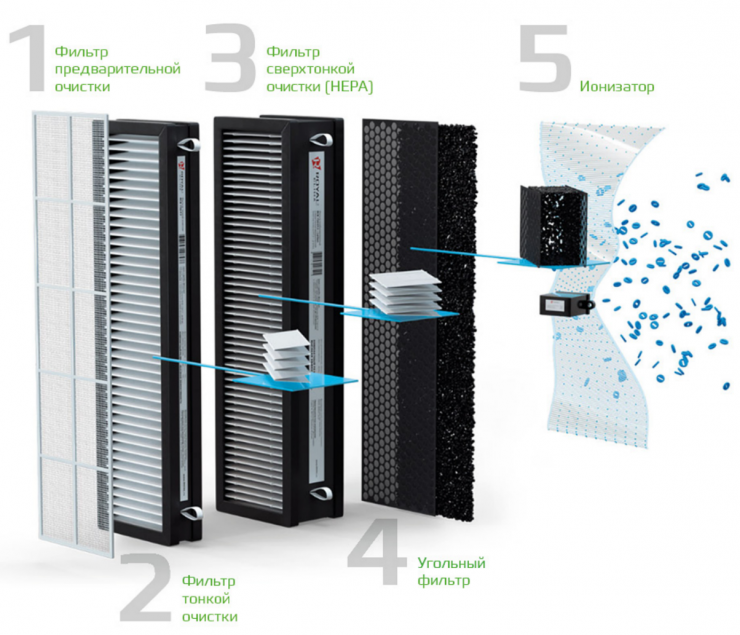 Эффективная очистка воздуха обеспечивается 5-ступенчатой системой фильтрации, состоящей из сетчатого фильтра предварительной очистки, механического фильтра тонкой очистки F7 и комбинированного механического и угольного фильтра H12 + carbon, который препятствует проникновению неприятного запаха и задерживает мельчайшие частицы пыли и аллергенов, очищая воздух до 99,5%. Встроенный ионизатор увеличивает качество воздуха, повышая работоспособность и улучшая самочувствие.