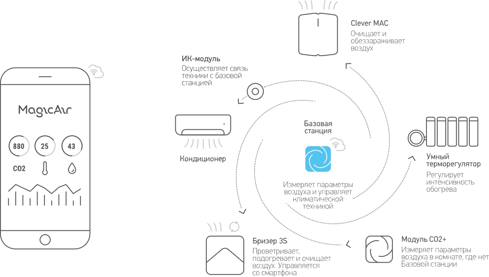 MagicAir — это система мониторинга качества воздуха и управления климатической техникой. Управляющий центр системы — базовая станция MagicAir. Компактный гаджет поможет сделать микроклимат комфортным и сэкономить ресурсы на работе климатических приборов.